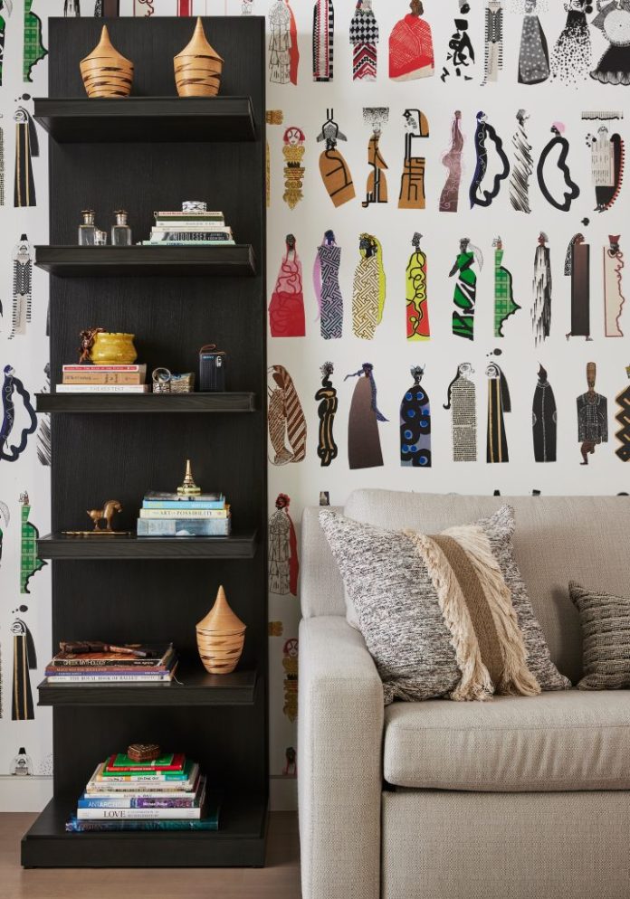 Don’t forget the background of your shelves. You can create a stunning showcase for your mementoes and books by using wallpaper or paint to set them apart. Having color or pattern peek through between the items on your shelves makes them more visually interesting. You can see that in our Seattle Glass House project above, with that lovely blue wallpaper from Phillip Jeffries.
